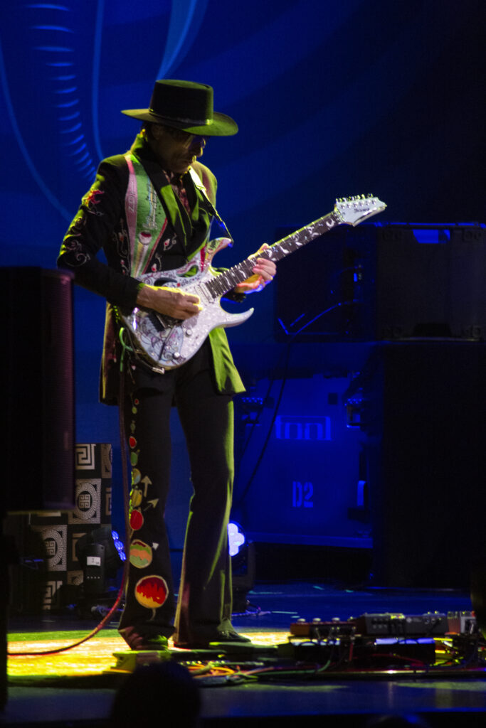 The second set began with Danny Carey taking center stage and began playing drum pads alone. It was the start of “Waiting Man.” Adrian soon joined him on the pads. Adrian had changed from a bright red suit to a black one. But the mood didn’t change. He was still all smiles. Next up was Tony, picking out the angular bass line. And Steve quickly joined in the action.