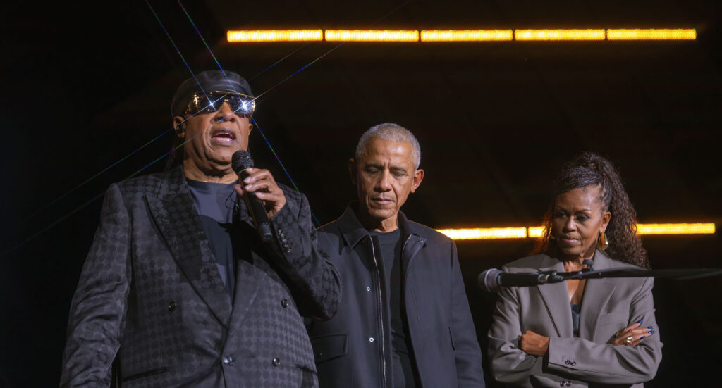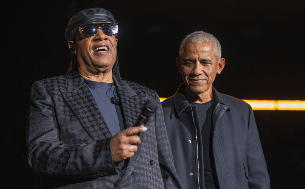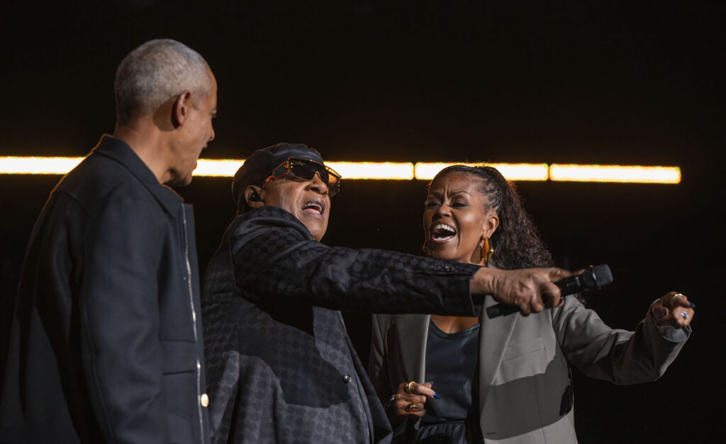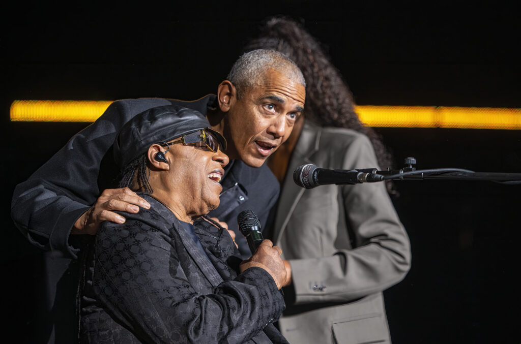 “We got friends!,” Stevie told the cheering crowd. Serenading fans and the Obamas, Stevie Wonder played a little bit of “Heatwave” with the words “landslide” swapped in. “I’m sick of people being angry and bitter. We ain’t about all that.”