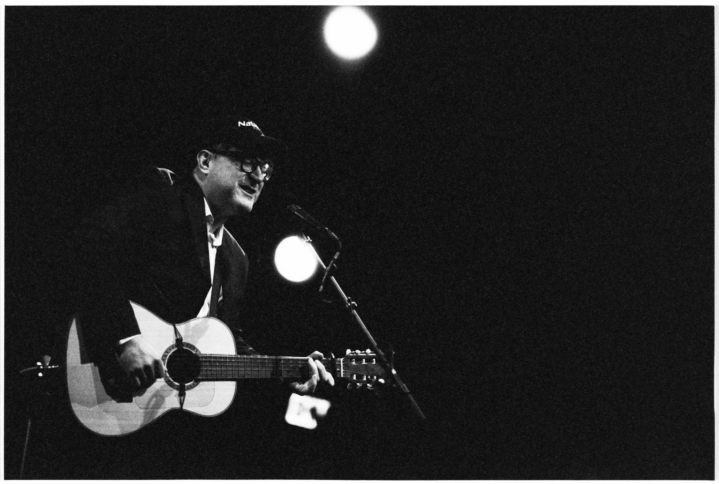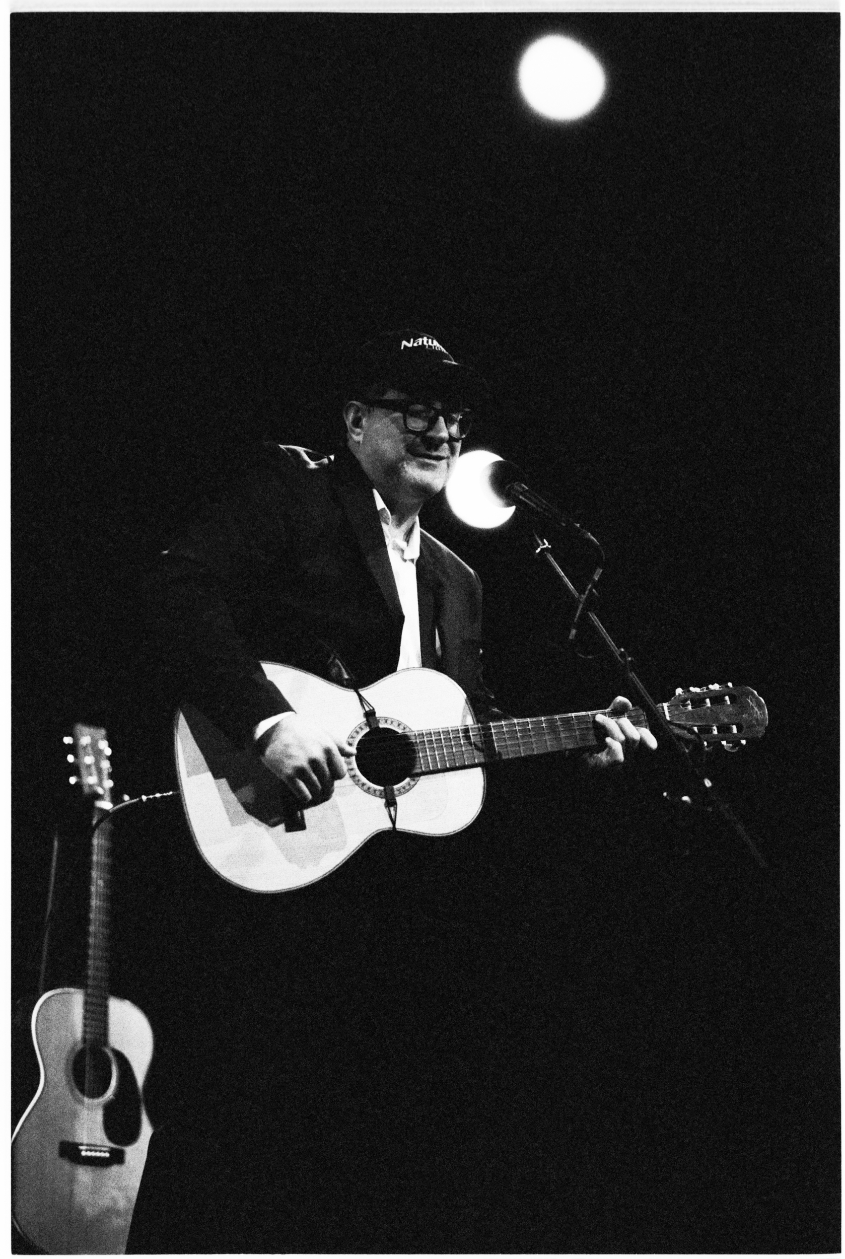 In a sport coat and a Natural Light hat, Finn was just as comfy as a guy at a bar surrounded by longtime friends as he rotated two acoustic guitars. One of them, he said, was a gift from an old pal. Though it was a modest six-string instrument, he told the room that the songs poured out of it when he first began to play it.