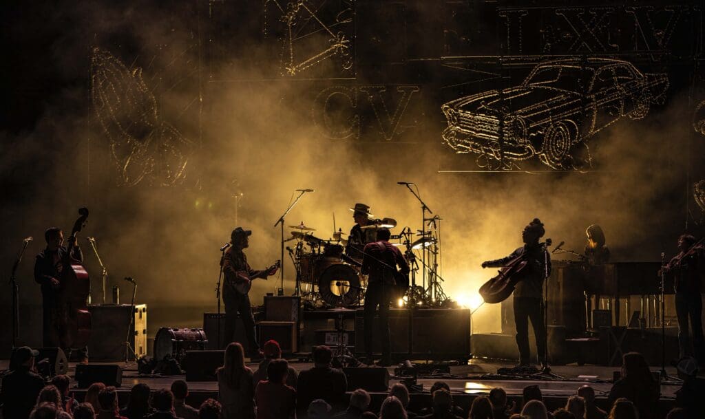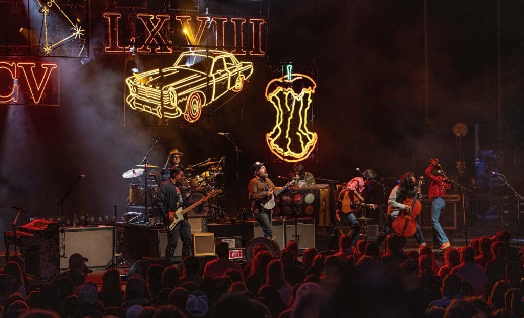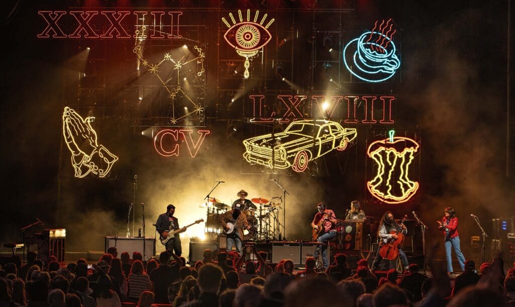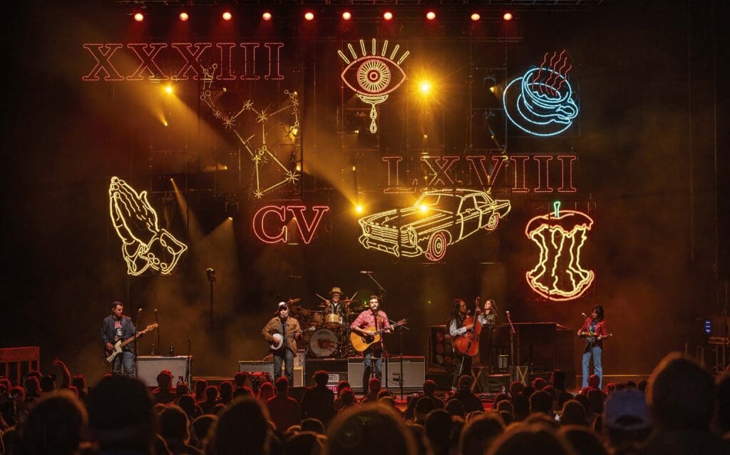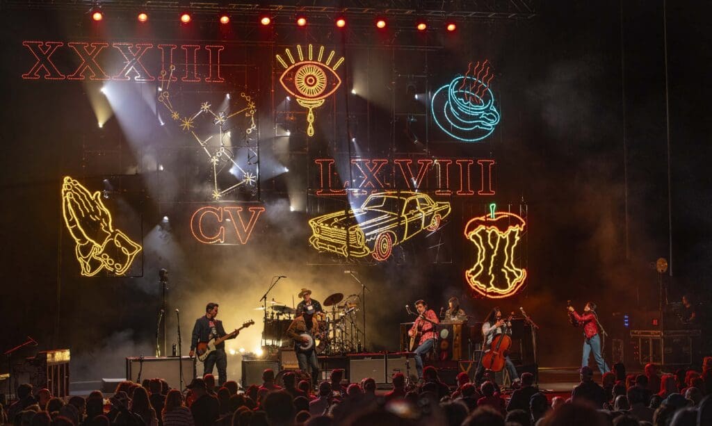 With the Roman numerals XXXIII, LXVIII, and CV (a mathematical representation of “The Avett Brothers”) illuminated in neon above the massive stage, the band continued with some old favorites like “Down with the Shine” and “Head Full of Doubt/Road Full of Promise.”