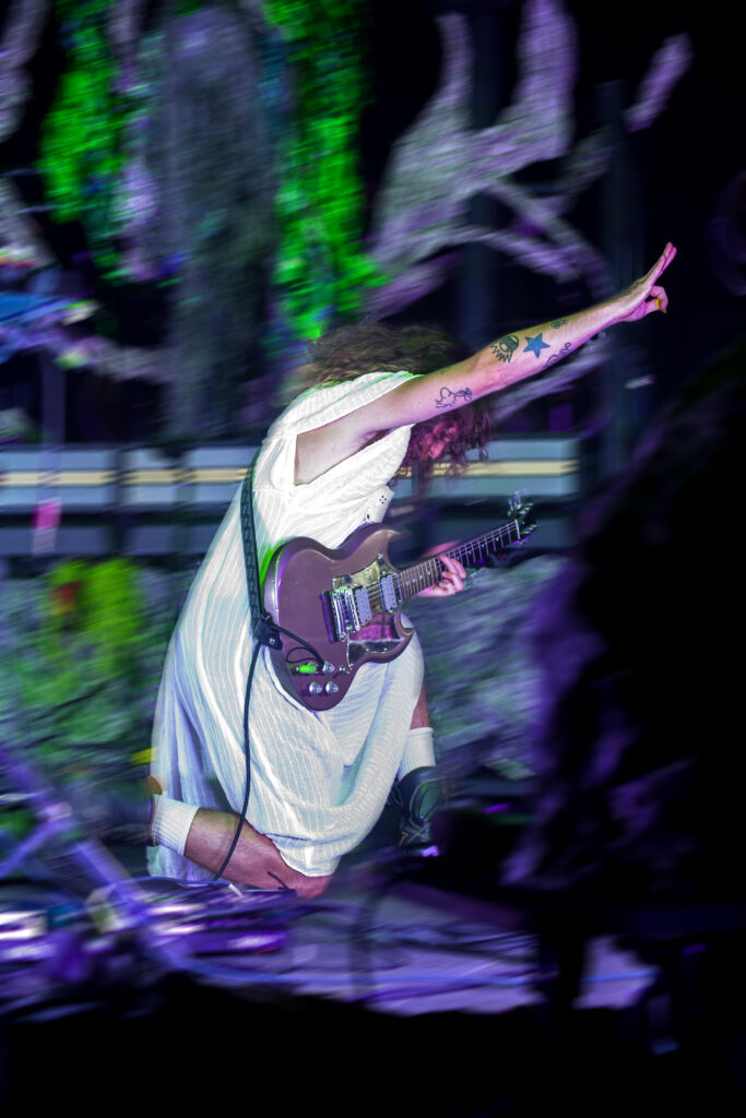Briston charged all over the stage while the first song, “Real Good Swimmer,” started. The stage was set up like a psychedelic campsite, complete with mossy rocks and twisted trees. When the song was over, Briston asked the crowd to pinky promise that everyone would have a good time that evening. The crowd agreed to the deal.