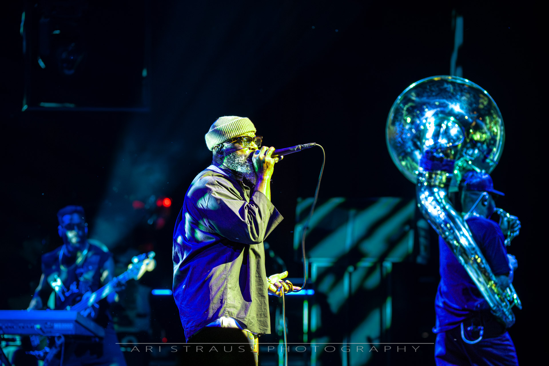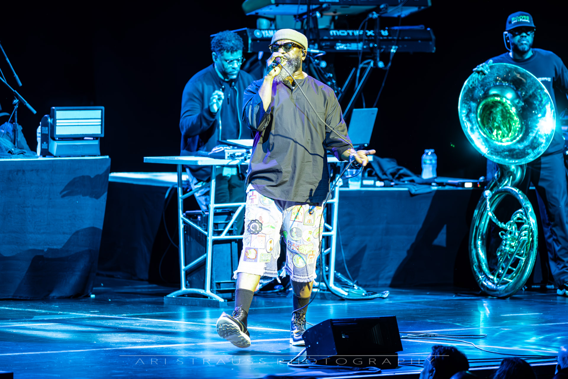 The Roots’ touring lineup remains a powerhouse ensemble: Questlove on drums anchoring every groove; Black Thought delivering rap verses with unmatched clarity and power; James Poyser on keys adding jazz-soul textures; Captain Kirk Douglas on guitar and vocals providing searing solos and harmonies; Mark Kelley laying down intricate basslines; Damon “Tuba Gooding Jr.” Bryson with his booming sousaphone lines; and Stro Elliot on percussion and production flourishes. Together, they formed a sonic unit that was both disciplined and adventurous.
