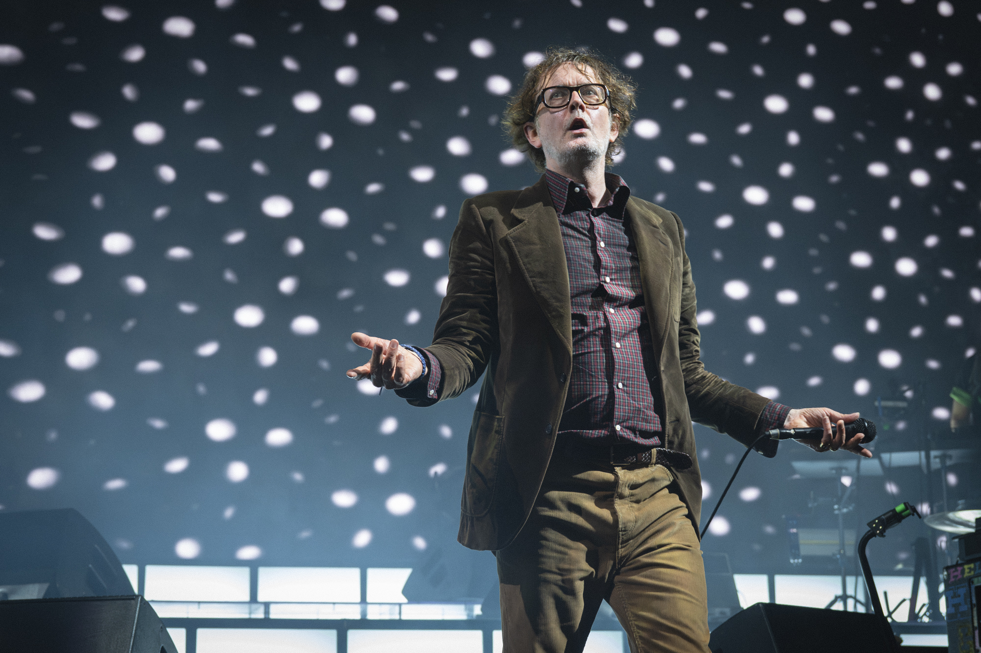 - Jarvis forgot the opening lyrics to “My Sex” and, after a false start, had to get one of the supporting musicians onstage to pull the lyrics up on their phone. Was it a bit? If so, it was still great. Also, he threw grapes and chocolates into the crowd while introducing “Farmers Market.”