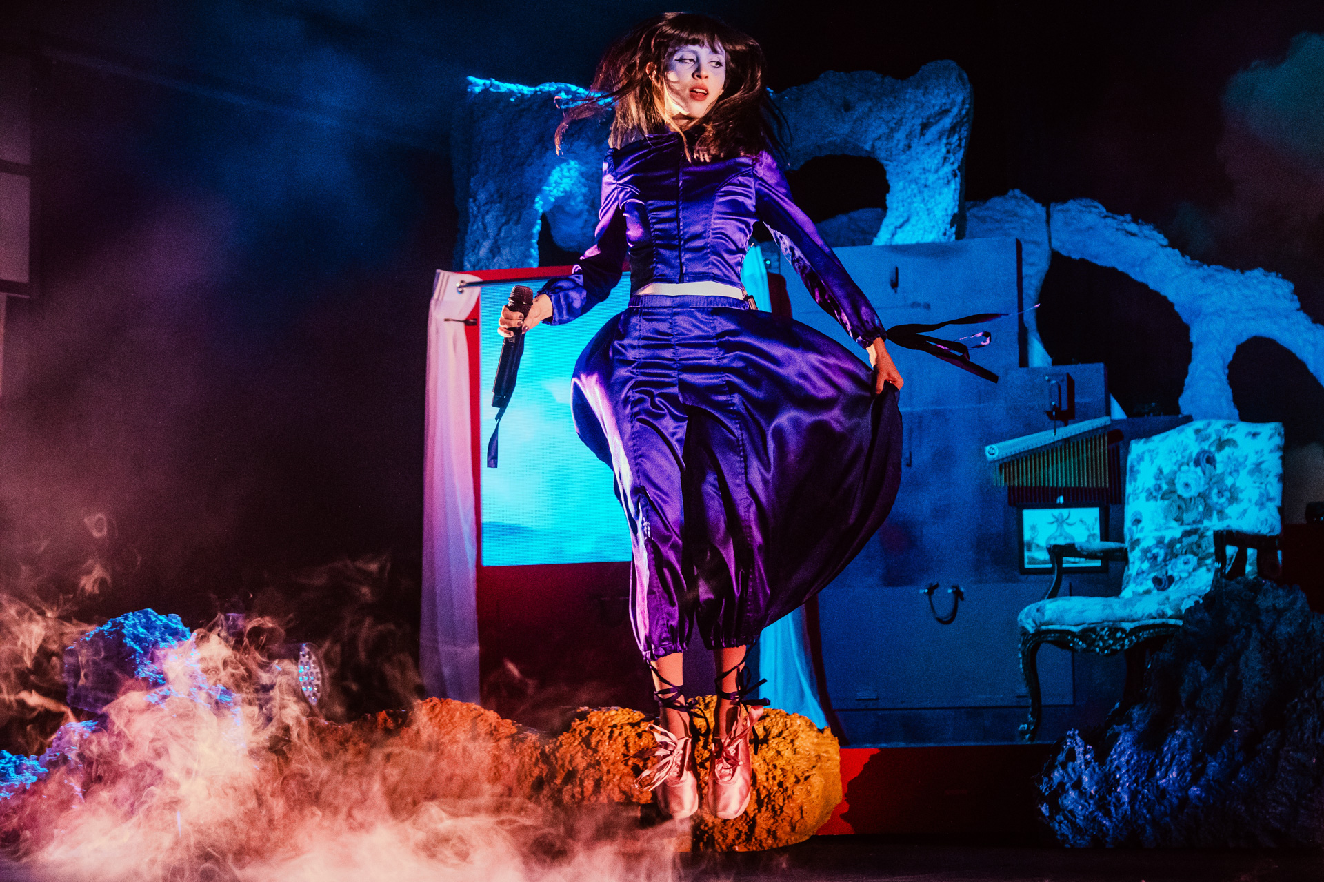 At The Anthem on Oct. 25, the band’s stage set had a cloud backdrop with surrealist imagery covering the stage. Mica emerged from the top of this structure and began “She Looked Like Me,” the first track off of Imaginal Disk, and continued into “Killing Time” and “True Blue Interlude” These are the first three songs in order as they appear on the album. It establishes Mica’s character of “Blue True:” a listless, vulnerable character trying to find her place in the world. “True Blue Interlude” is played like an infomercial, beginning with the line, “Say hello, it’s you, the purest you,” convincing her to delve into this mysterious “True Blue” procedure. It can help her reach self-actualization, but will rewire her whole being in the process. The hypnotic synths and vocals from “True Blue Interlude” blend flawlessly into “Image,” which depicts Blue’s deliberations about getting the Imaginal Disk: “But oh, my God, 22 more minutes. Oh, so hot. Meet your brand new image.” In the music video, Blue transforms into “Red True,” but in the live show this transformation comes later.