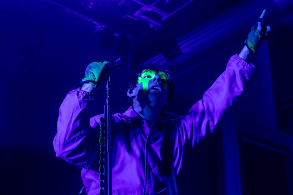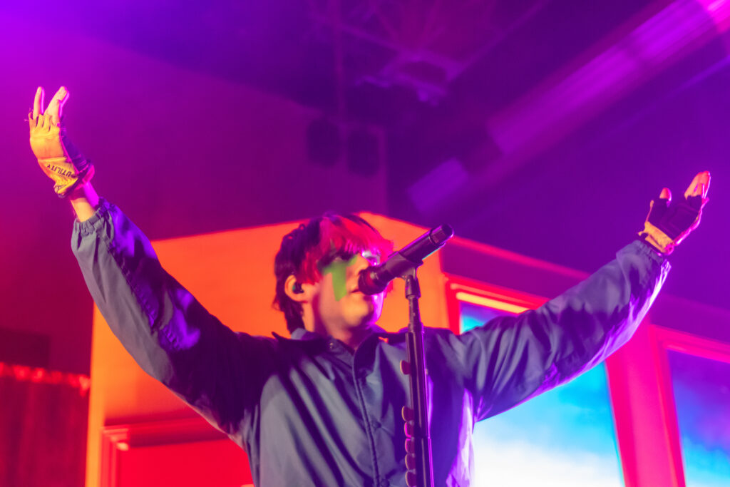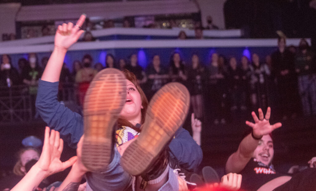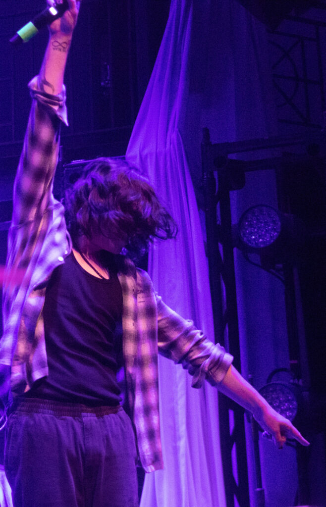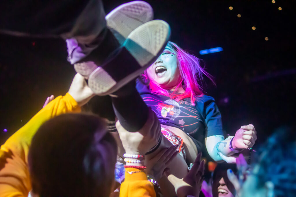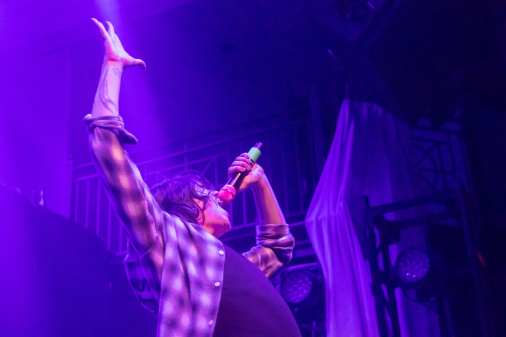 From the moment someone stepped on stage — including the openers — fans were crowd surfing, and though many had x-es on their hands, symbolizing under 21, they were absolutely veterans at it. Much like a slide at well, a waterpark, fans would crowd surf from the sound board front of house to the front of the stage, land in front of the barricade, and run to the back to do it again. The crowd’s energy was electric, unlike any crowd I had witnessed at 9:30. At the same time, mixed in between mosh pits and rambunctious crowd surfers, off to the sides, friends were dancing and hugging.